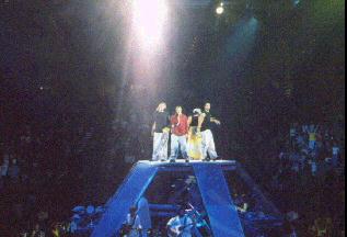 it was so funny cuz i have to crouch over to the person next to me to get that picture. you can tell they're playing around with stuff right?? brian's in the red and nick is in the black. this was during the time when they were introducing the dancers and the band members..and if you looks closely..(not that close..) you can see howie on the top pointing out a band member (i forgot which one..LOL can u tell i'm forgetful? well, not THAT forgetful..i just forgot alot about this cuz i was just too excited to try and remember???). the whole concert was just soo much fun. i wanna go to another one this year! HAHA..those 75 buckeroos was just totally worth the show. well, i'm so sorry this wasn't a big ol' review...i just really wanted a place to put some of my pictures (even though they're not at their best..) and tell about some of the ultracool (HAHA ultracool) things that happened..and i'm hoping that some of you people that didn't make it to the 1999 tour to see a little bit of what it was like and uh, well..here's a little wish for you and me to be able to go to one of the concerts of the 2000 tour. ;)